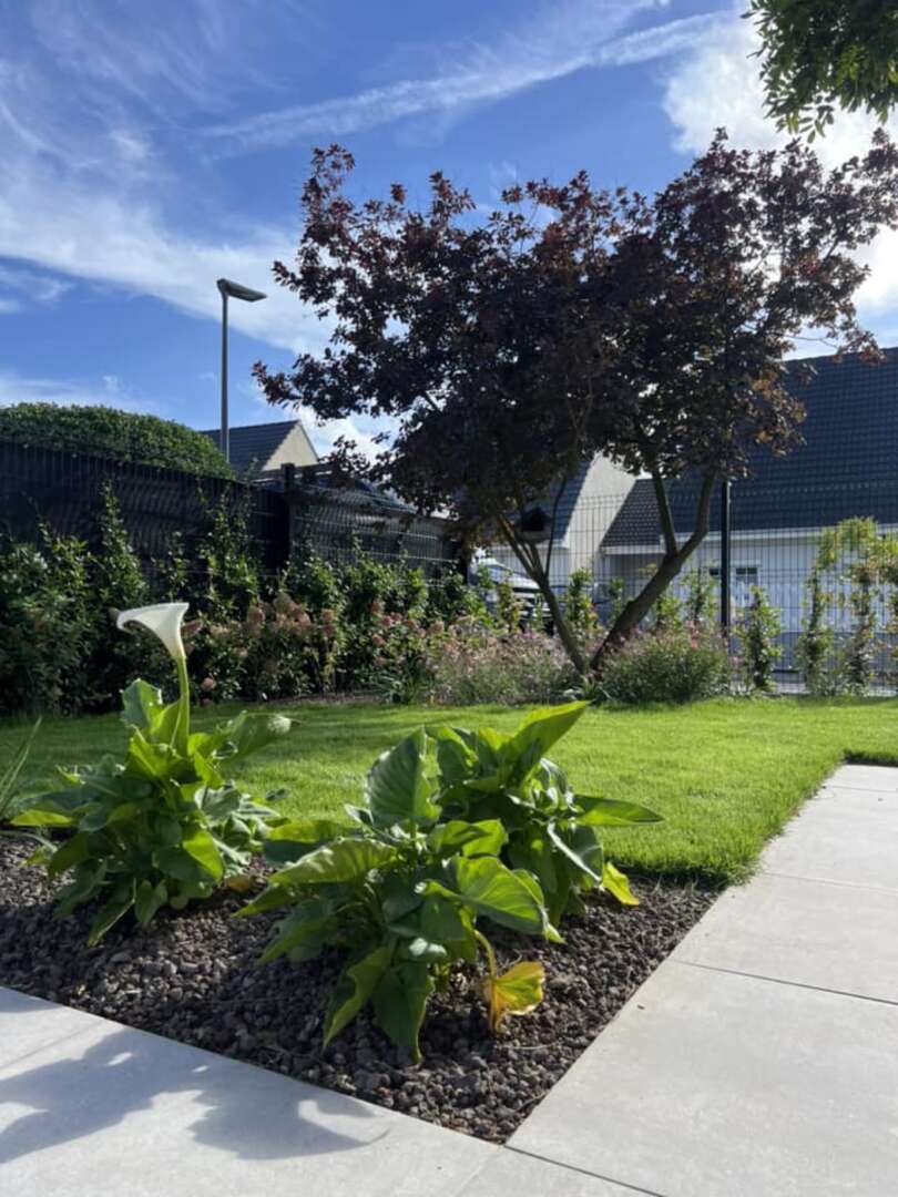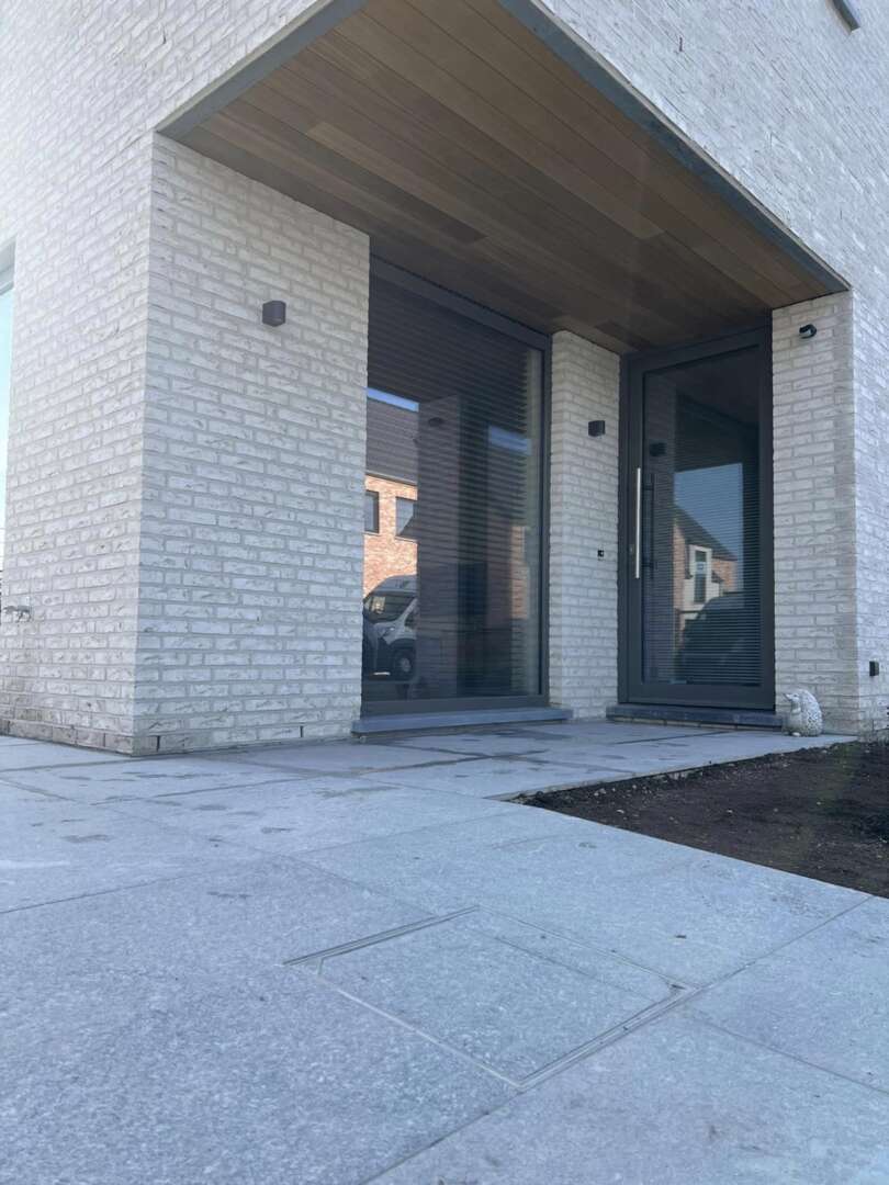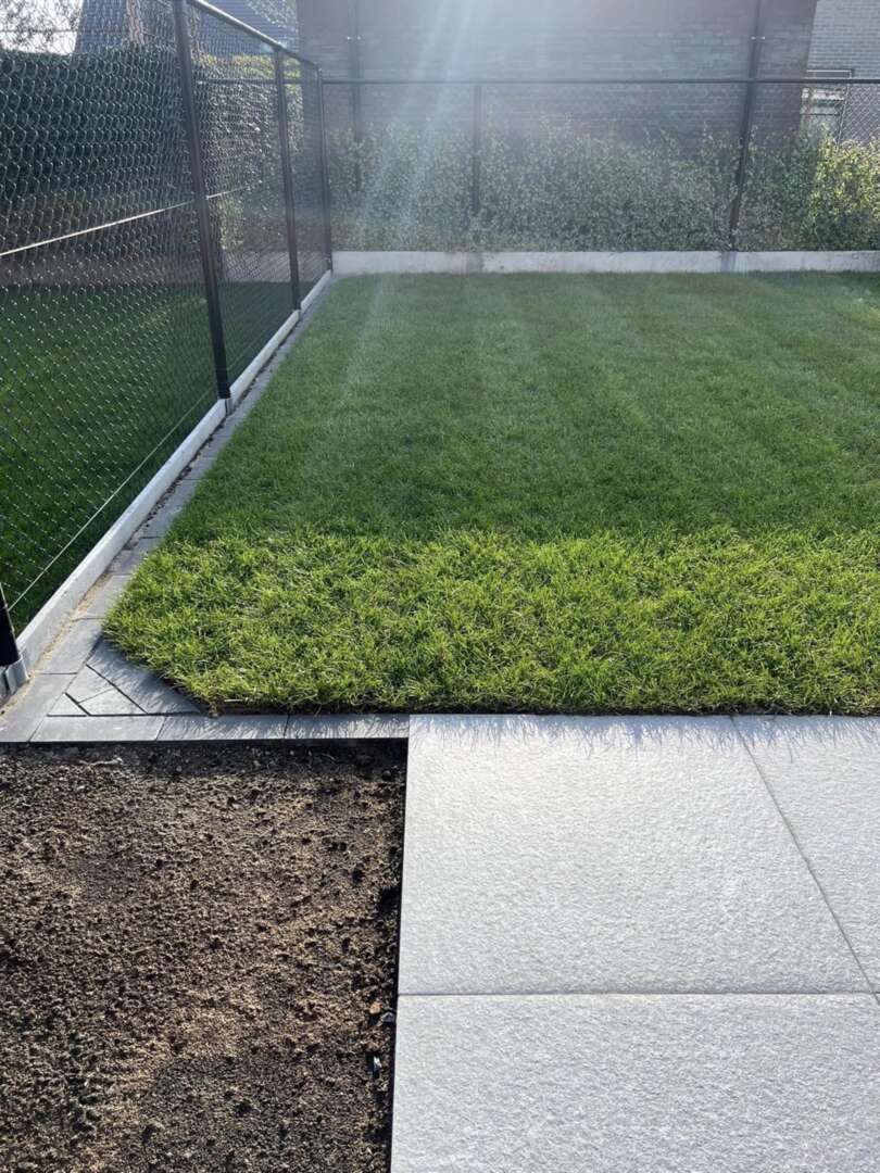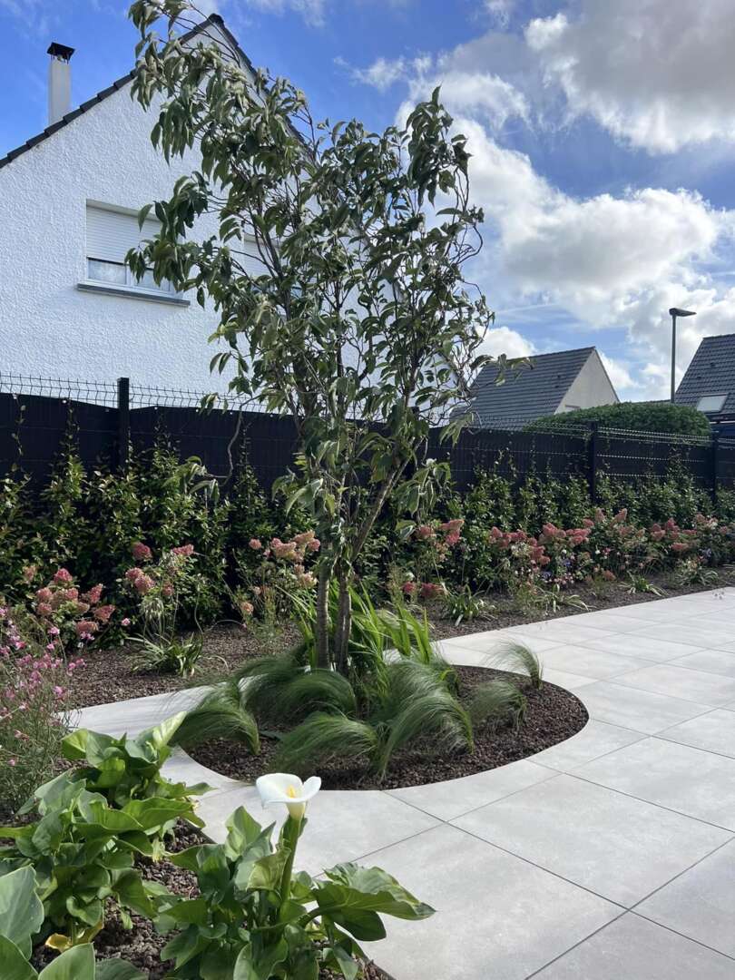 Laissez-vous tenter par une belle terrasse en céramique grise et un gazon sur rouleaux et une belle finition en dallage moderne Marchall tous les contours du gazon pour faciliter la tonte du robot et moins de travail pour vous bien sûr.