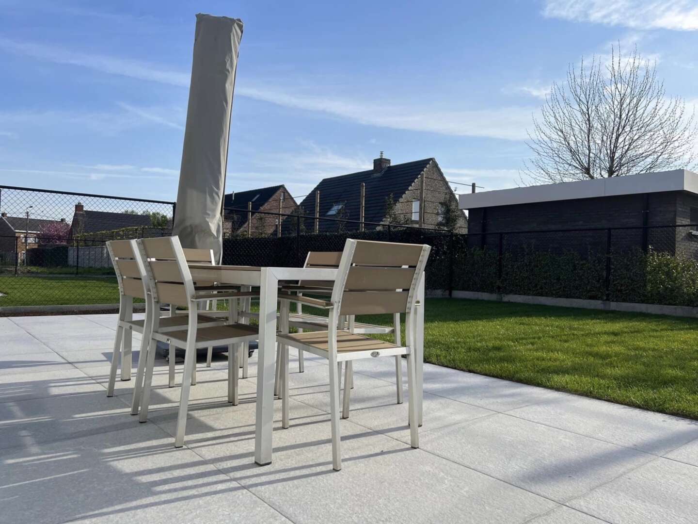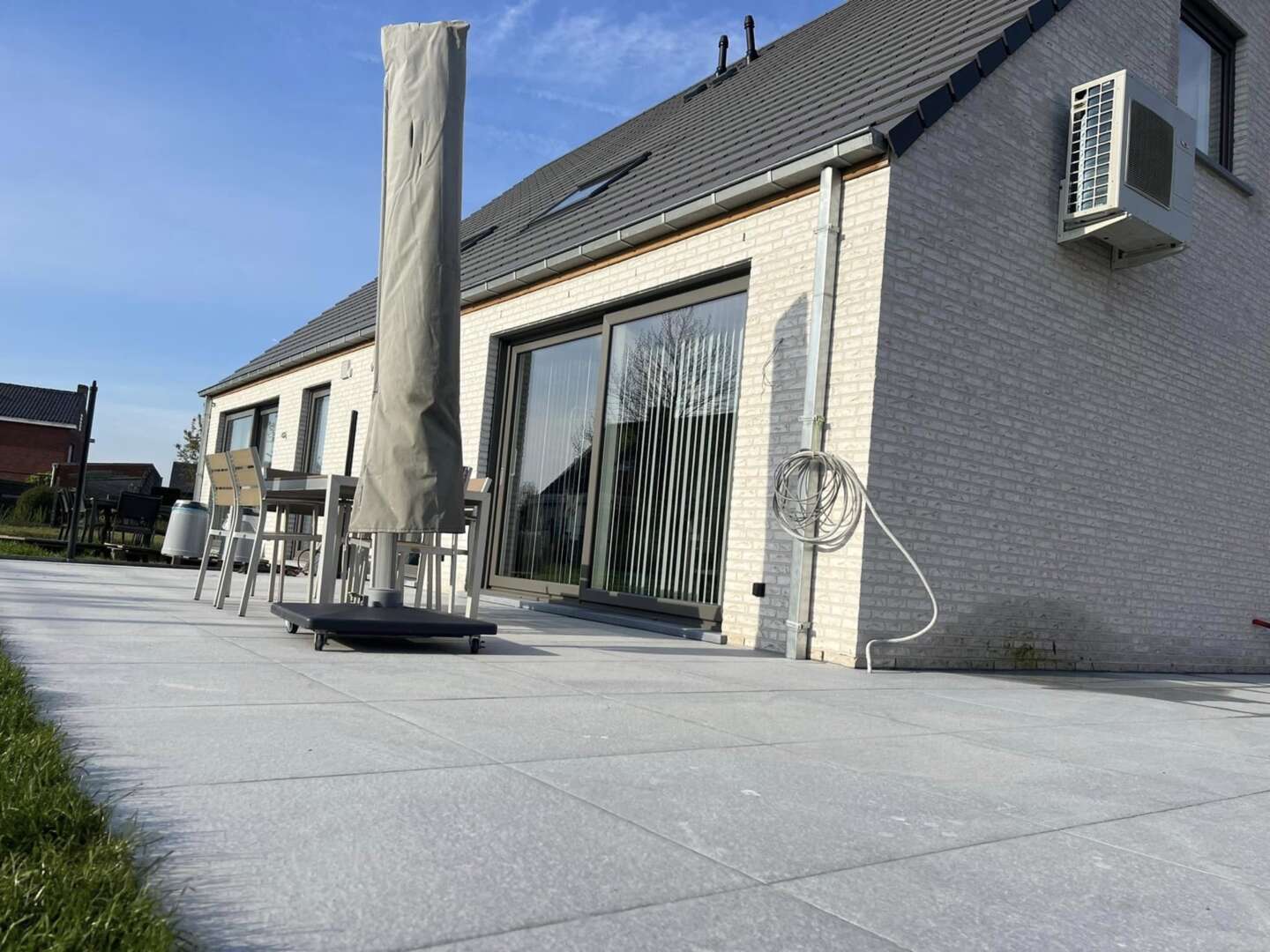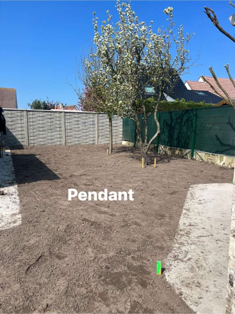 Laissez-vous tenter par une belle terrasse en céramique grise et un gazon sur rouleaux et une belle finition en dallage moderne Marchall tous les contours du gazon pour faciliter la tonte du robot et moins de travail pour vous bien sûr.